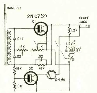 The purpose of this circuit is to detect whether a coil has shorted turns. The coil must be fitted to the ferrite rod used as a sensor. The circuit is from a Radio Electronics from January 1963.