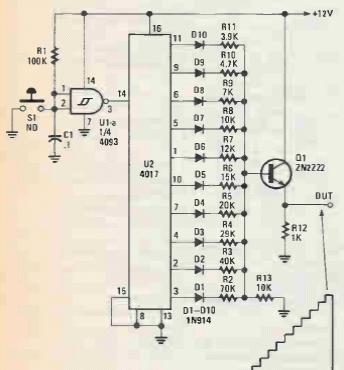 This circuit was found in Popular Electronics from 1992. The circuit has steps determined by resistors. The circuit is CMOS and can be powered by other voltages.