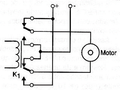 To invert the rotation of a motor by changing the levels of an Arduino output or another microcontroller, we can use a 5 V relay as shown in the connection below. The engine has independent power. To turn the engine on and off we can use a second relay. For higher voltage relays it is convenient to use an excitation stage as given in the next circuit.