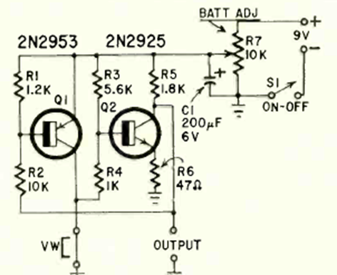 An oscillator slightly different from the previous one also appeared in Radio Electronics magazine in May 1968. The circuit uses a current source to power the wire that vibrates between the poles of a magnet.