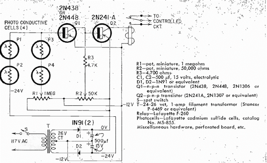 This circuit had its assembly described in Radio Electronics from July 1964. The circuit uses LDRs adjusted to have a reference and thus serve as a contrast sensor. The circuit activates a relay and is powered by a 12 V source.