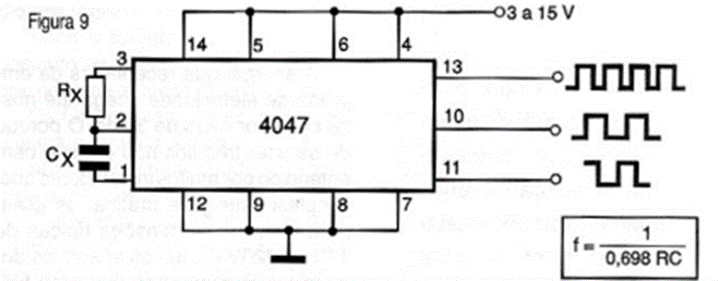 In the circuit in the figure, we have the production of rectangular signals with frequencies of up to approximately 1 MHz. The oscillator in question has three outputs with characteristics that may be interesting for many projects. On pins 10 and 11 we have rectangular signals of the same frequency, but with inverted phases, while on pin 13 we have a rectangular signal with twice the frequency of the previous ones. The operating frequency depends on Rx and Cx and can be calculated using the formula in the diagram. Rx should not be less than 1 k ohms. This oscillator can be powered by voltages between 3 and 15 V and the maximum operating frequency, which depends on this voltage, is around 2 MHz for 12 V supply.