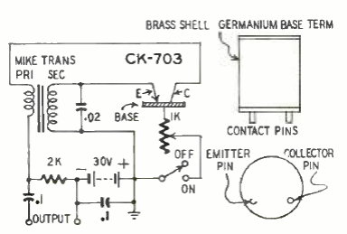 This is the first transistorized circuit published in the Radio Electronics magazine from over 1950. It is a simple audio oscillator that can be used as a signal injector. The transformer provides the feedback. Note that the base is the shell.