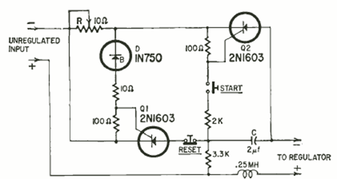 This circuit switches off a load in case of excess current acting as a fuse. The circuit is from a Radio Electronics from January 1965.
