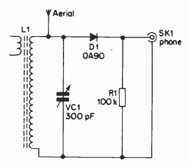 This is the common configuration of a crystal or galena receiver that uses a crystal or high impedance headphone. L1 has 100 turns of wire 28 in a ferrite rod.