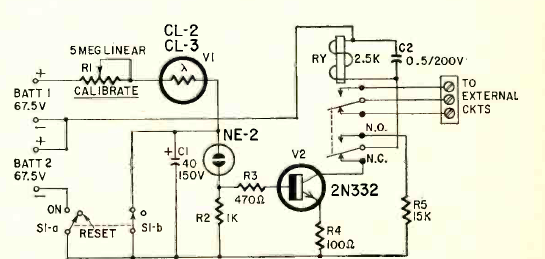 This 1-transistor timer was published in Radio Electronics magazine in December 1960. The circuit has reversible contacts and locking features and is battery powered.