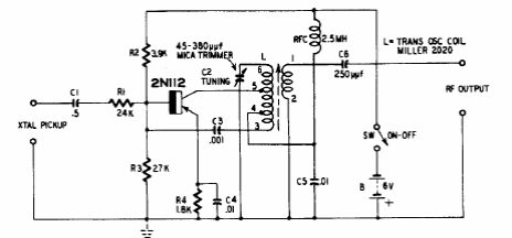 This circuit transmits signals from a turntable to a nearby AM radio. The circuit is from a documentation from the 60's. The transistor used is a germanium type of the time.