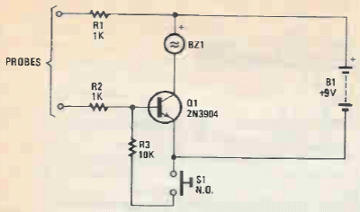 This simple circuit was found in Popular Electronics from 1992. The transistor is a general-purpose type, and the buzzer is an oscillator type according to the supply voltage.