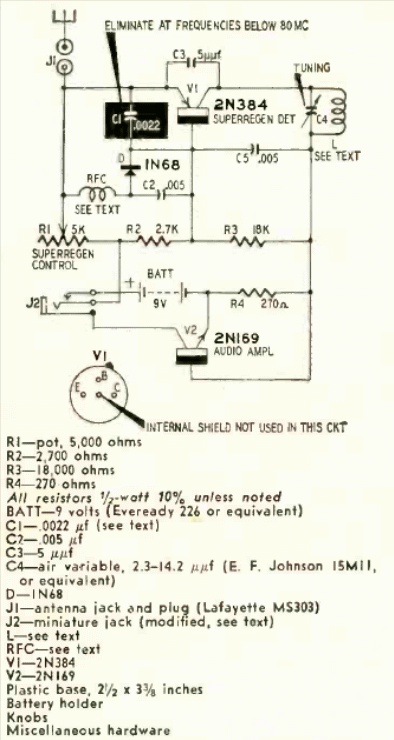 This 2-transistor circuit was found in the March 1958 Radio Electronics magazine. The coil determines the tuning range. Listening is on high impedance headphones.