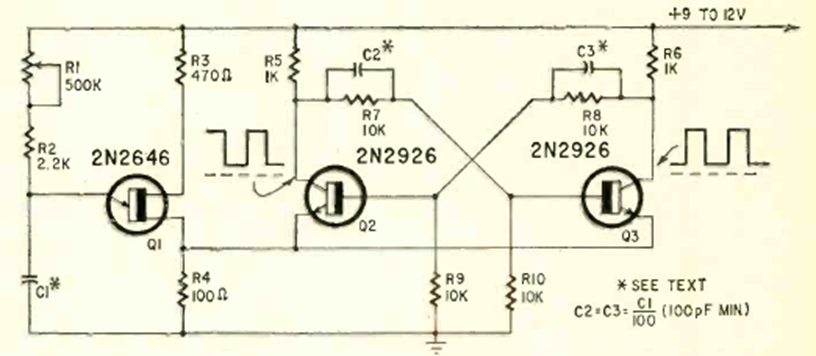 In this circuit, a unijunction transistor controls a multivibrator providing a rectangular signal with a frequency given by the adjustment of P1 and C1. The circuit is from a Radio Electronics from July 1968.