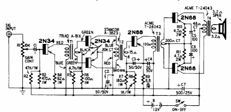 Found in American documentation from the 1960s, this circuit employs power transistors of the time. The coupling between the stages is done by a transformer.