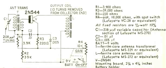 This simple circuit with good gain using just one transistor was published in Radio Electronics magazine in September 1959. The circuit is powered by a 9 V battery with low consumption.