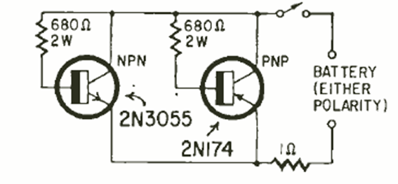 This circuit consists of a controlled charge to discharge batteries under test. The circuit is from a Radio Electronics from April 1966. The 2N3055 started to become popular around this time. Must be mounted on heat sink.
