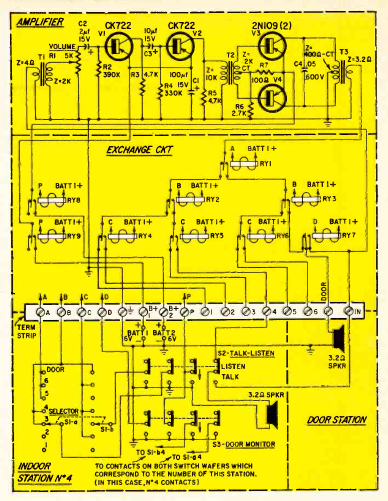 Found in the June 1962 Radio Electronics magazine, this circuit uses 4 transistors. The range depends on losses in the cables and switching is done by relays.