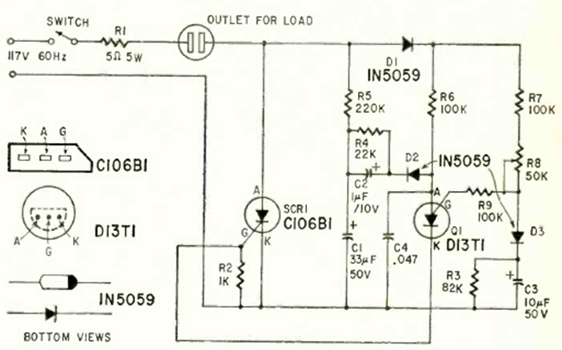 This unijunction programmable transistor circuit was found in the December 1968 issue of Radio Electronics magazine. The circuit is a half-wave control for incandescent lamps only.