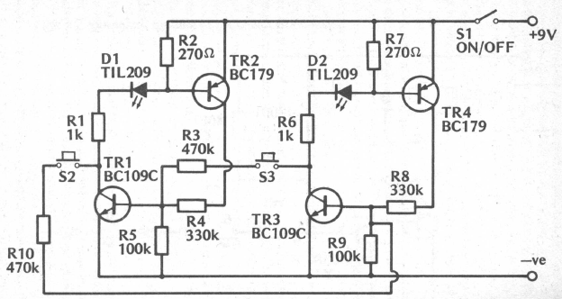 This circuit was found in old documentation. Transistors can be BC548. The LEDs are the same.
