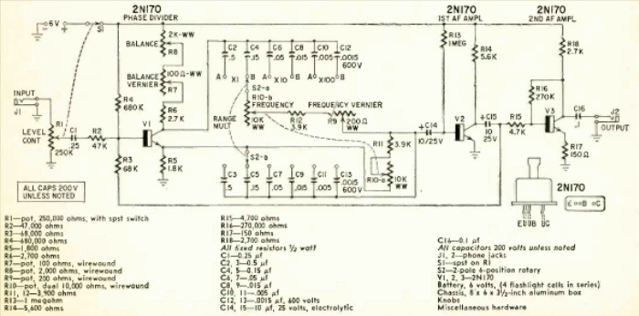 We found this sophisticated meter circuit in an article in Radio Electronics magazine from June 1959. The article taught how to assemble it. Transistors are common types at the time.