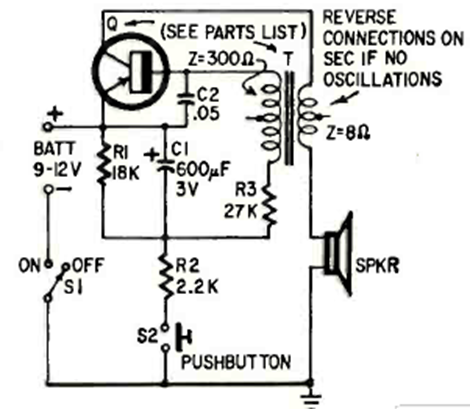 Presented as an electronic siren, this circuit was found in Radio Electronics magazine from June 1966. The frequency and siren effect are given by capacitors C1 and C2.
