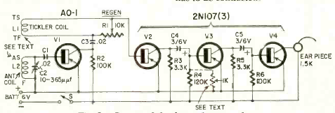 The assembly of this regenerative receiver for medium waves with 4 transistors was described in an article in Radio Electronics magazine from April 1961. Listening was via headphones and powered by a battery.