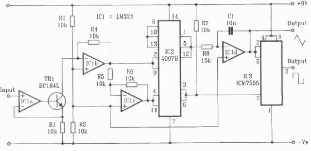 This circuit has a duty cycle of 50%. We found it in old English documentation. The center frequency is around 1 kHz.