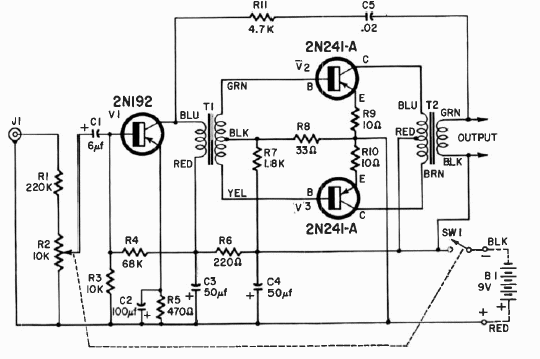 Found in a 1966 publication, this circuit has fractional watts of power, serving as a general-purpose bench amplifier. The transistors are germanium types of the time.