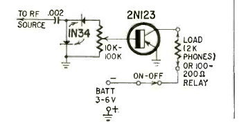 This simple amplified relay circuit works on RF signals. The power supply is according to the relay. We found it in a Radio Electronics from September 1962.
