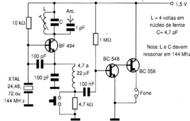 This transceiver is also low power, but this time, it can generate signals in the 144 MHz band. In the case of this frequency, the crystals must be submultiples of it. For example: using a 24 MHz crystal, the sixth harmonic will fall at 144 MHz, and so on. What is done is always tune the tank circuit (coil and capacitor) to this frequency. The operating principle is similar to the previous circuit and allows a wide range of experiments, without the risk of burning or damaging the components. Contacts can be attempted with other amateur radio stations.
