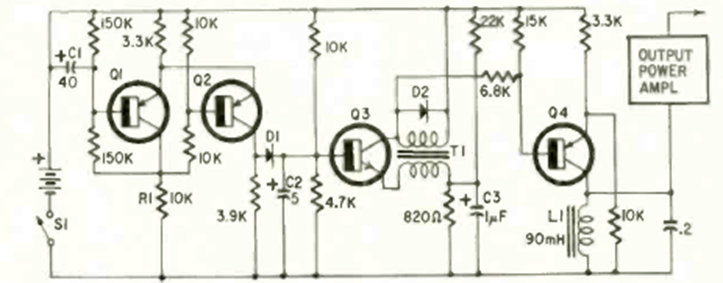 This transistorized siren was found in the patent section of Radio Electronics magazine from March 1968. The circuit uses components from the time and has a very elaborate configuration.