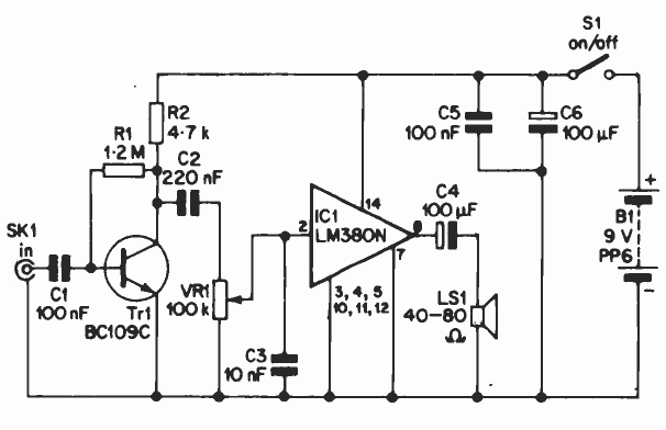 Using the LM380, this circuit provides a power of the order of 200 mW. In it we have a stage of pre-amplification for microphone. The power supply can be 6 to 12 V.