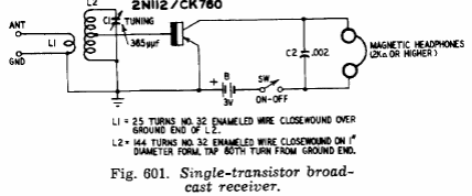 Using earphone for listening, this receiver has only one germanium transistor. The circuit is from an American publication from the 60's. The phone must be a high impedance type.