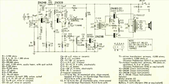 This circuit is from a Radio Electronics from February 1959. The circuit has a speaker output and good sensitivity. Power is supplied from a 9 V battery.
