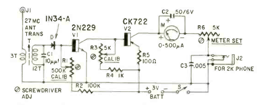 This field strength meter for the 11-meter range was found in Radio Electronics magazine from October 1960. The circuit uses an analog indicator and has two transistors.
