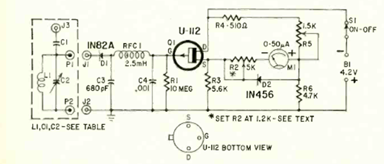 This field strength meter circuit was found in the March 1968 Radio Electronics magazine. The transistor used is a field effect transistor and can be replaced with a modern type. The coil determines the tuned frequency range.