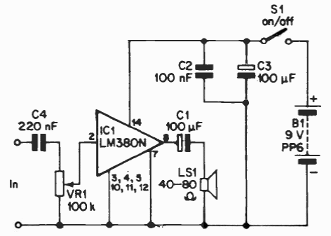 This 200mW amplifier was found in old documentation. It can be powered with voltages in the range of 6 to 9 V. The circuit has excellent sensitivity.