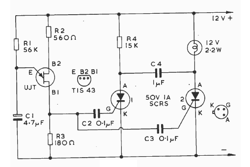 This alternating flip-flop has a configuration explored in other articles on this site. The frequency is basically given by C1 and the unijunction can be 2N2646 as well.