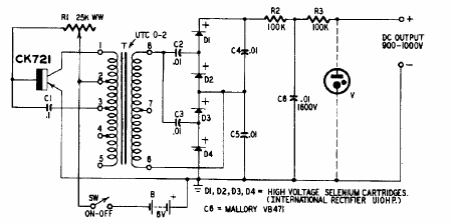 This high voltage source circuit was found in an old American publication. It uses a voltage regulator valve. The circuit is suitable for tubes.