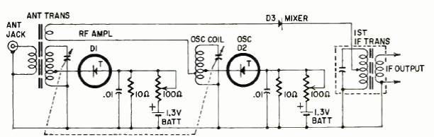 This FM receiver input circuit with tunnel diodes was found in documentation from 1952. The circuit has good gain and has low supply voltage.