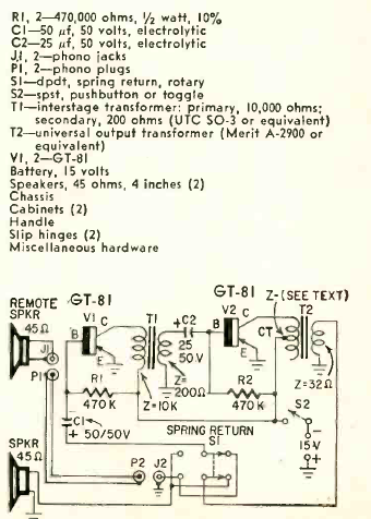 This circuit was found in Radio Electronics magazine from June 1961. The distance between stations is limited by losses in the cables. Power is via battery.
