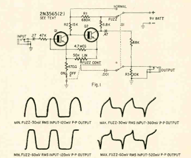 This circuit with two transistors was found in Radio Electronics magazine from February 1968. The circuit uses components from the time and is sandwiched between the instrument and the amplifier input. The waveforms are shown.