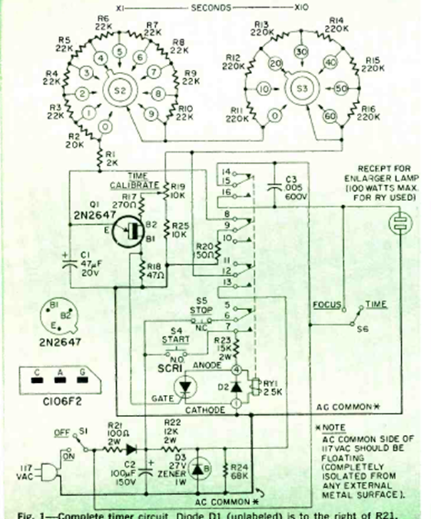This circuit was originally described for use in photographic enlargers. The circuit is from a Radio Electronics magazine from December 1969. The resistor networks can be replaced by potentiometers.