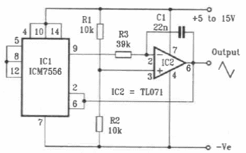 The oscillator circuit is an ICM7556, the dual CMOS version of the 555. The frequency depends on the capacitor and for this circuit with 22 nF it is around 1 kHz.