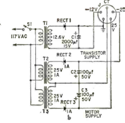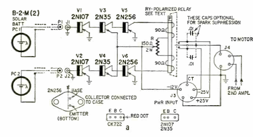 This interesting circuit appeared in the April 1952 Radio Electronics magazine. The circuit is perhaps one of the first transistorized designs in a technical magazine using the 2N107/2N35 to control servos in a photocell system. The circuit uses period servos. The two circuits are given below.