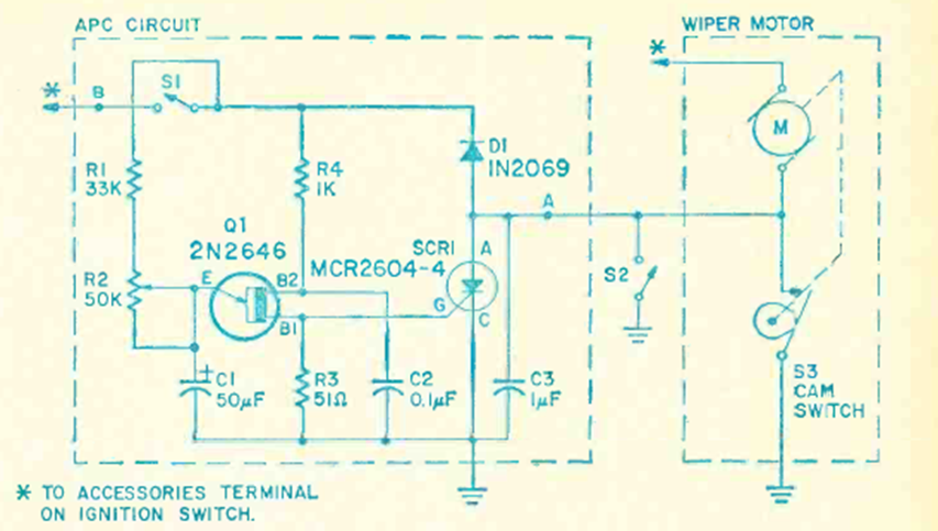 This simple circuit with SCR and unijunction transistor appeared in Radio Electronics magazine in July 1968. The time adjustment depends on C1 and potentiometer R2. The circuit is suitable for cars of the time that did not have this feature.