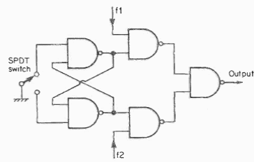 This circuit is intended to switch two signals of different frequencies that appear at the output. The circuit is TTL and must be powered by 5 V.