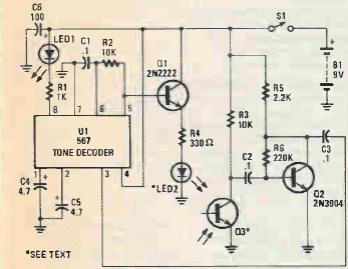 We found this circuit in a 1992 Popular Electronics. The circuit has an optical sensor with LED and phototransistor. The other components are common.