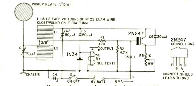 We found this circuit in a Radio Electronics from October 1960. The circuit uses just one transistor and triggers a sensitive relay. Power comes from batteries.
