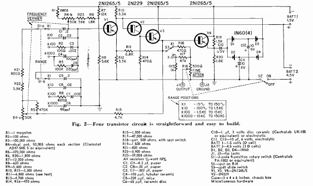 This bench circuit had its assembly described in the Radio Electronics magazine of February 1962. The circuit has several frequency bands and is battery powered.