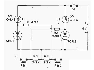 Using common SCRs like the TIC106, this circuit is loaded with incandescent bulbs, but can be changed to use LEDs or beeper circuits.