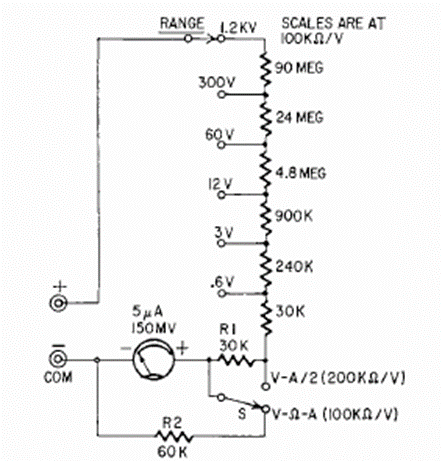 This is the circuit of a sensitive voltmeter using a difficult-to-obtain 5 uA full-scale instrument. The circuit is from a Radio Electronics from November 1963.