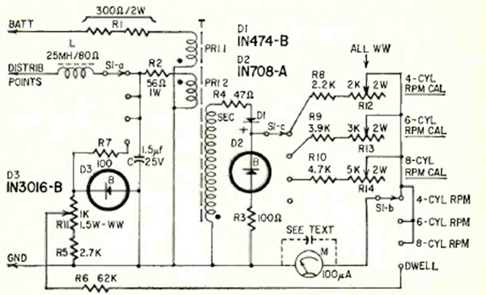 Dwell meter is the English name given to the opening angle meters of old plated cars. We found this circuit that combines the two meters in a Radio Electronics from March 1965. The circuit uses an analog instrument.